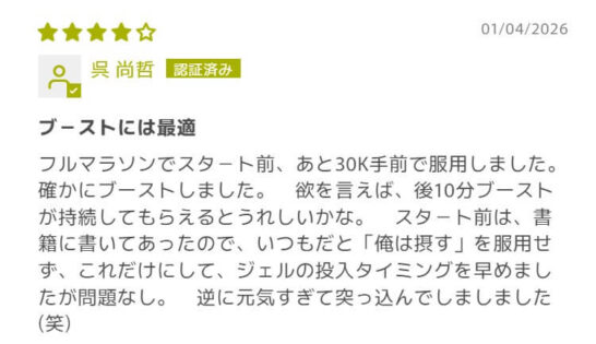 フルマラソンでスタート前、あと30K手前で服用しました。確かにブーストしました。欲を言えば、後10分ブーストが持続してもらえるとうれしいかな。